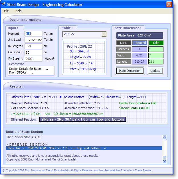 • Steel Beam Design  ابزاری برای طراحی تیرهای ساده فلزی متشکل از پروفیل های معمول  تکی  یا دوتایی بهمراه پلیت های تقویت بال